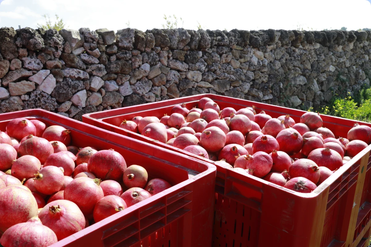 La raccolta avviene quando la melagrana ha raggiunto la maturazione ideale. Ogni cassa viene subito etichettata con il lotto di provenienza, così possiamo tracciare il frutto dall’origine della filiera.